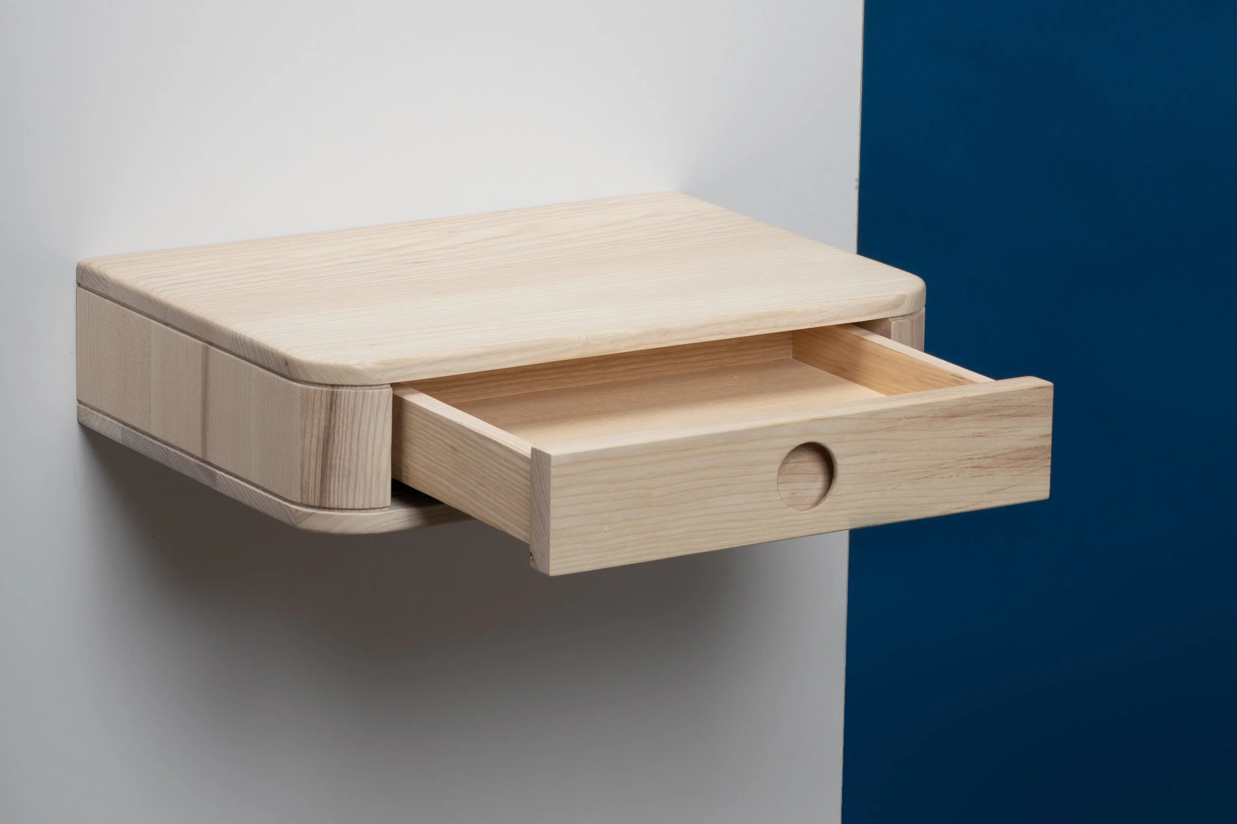 Der ‘Fife’ Nachttisch überzeugt mit einer einfachen, modernen Form und wird aus europäischer Esche handgefertigt. Der Nachttisch lässt sich durch ein einfaches Befestigungssystem bündig mit der Wand montieren.
